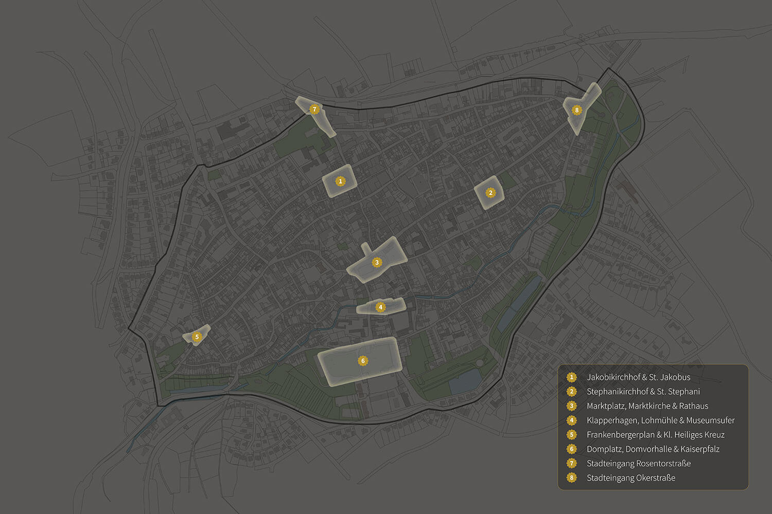 Die Aufgabe der Stadtillumination ist, die Vielfalt des historischen Stadtkerns mit seinen unterschiedlichen baulichen Strukturen zusammenhängend darzustellen. Für Goslar wurden diverse Lichtprinzipien entwickelt die für die nachfolgende Planung die Grundlage bilden sollen.