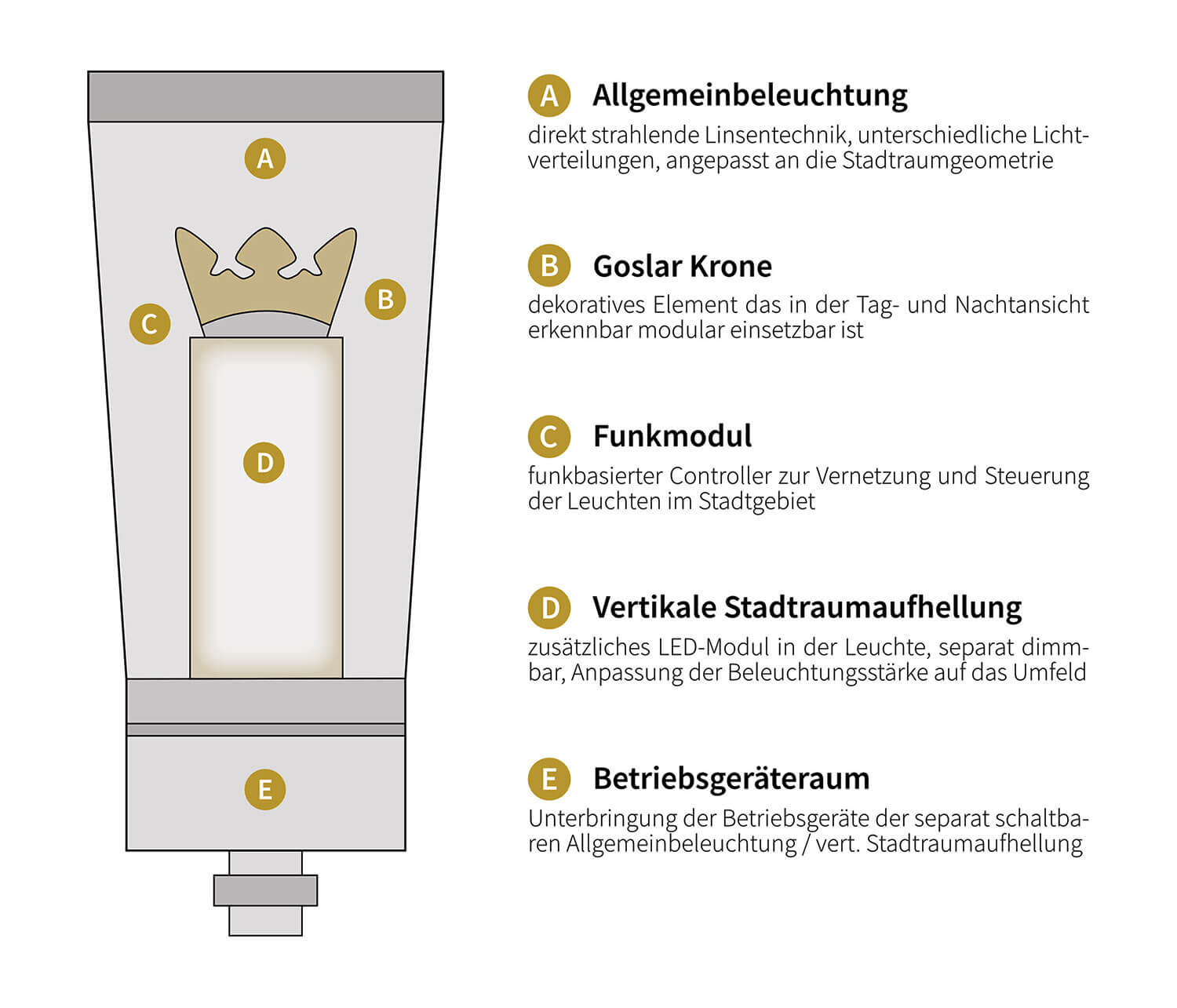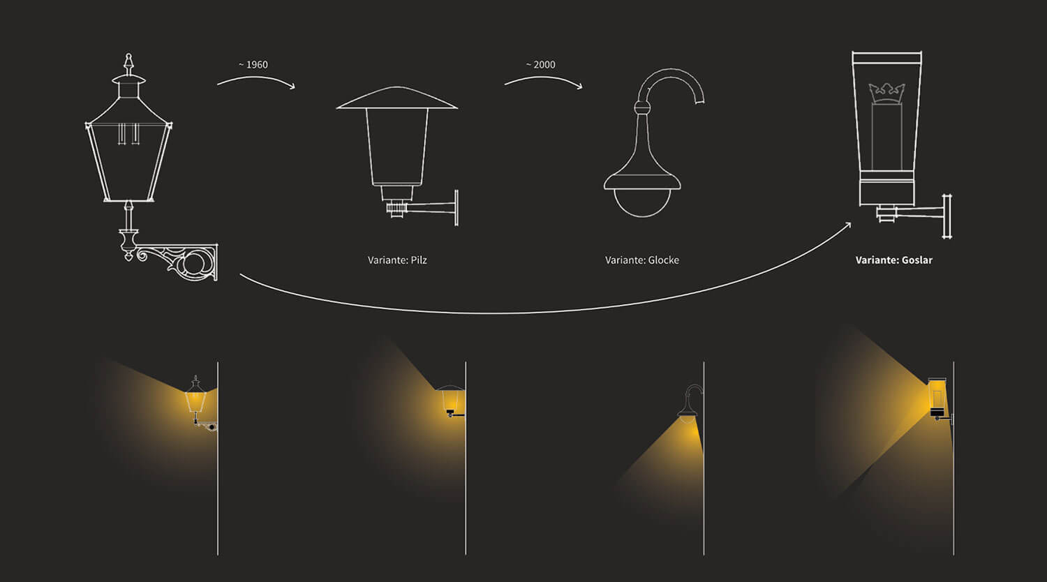 Die Umsetzung erfolgt mit einer auf die Anforderungen abgestimmten Leuchtenfamilie „Goslar“. Ihre Formsprache greift Gestaltungsmerkmale historischer Gasleuchten der Altstadt auf und überführt sie in eine zeitgemäße, zurückhaltende Interpretation.